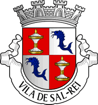 Sal-Rei Arms - Quartered shield. In the first and fourth, in red, a silver salt shaker decorated with gold. On the second and third, silver, a band of blue catfish. Mural wreath of four silver towers. White ribbon, with the words "VILA DE SAL-REI".