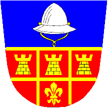 azure a footsoldier's helmet argent; gules bordered or, three castles or;