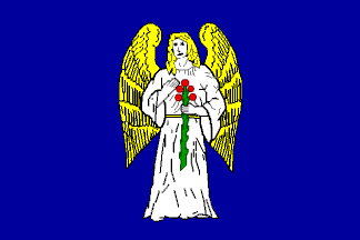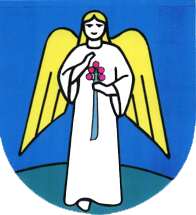 Description: Azure, an angel argent haired or, holding a green plant