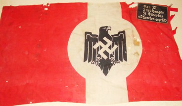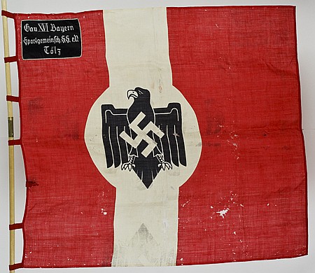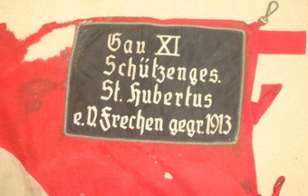 Editorial Comment: The black patch on this Schützenfahne (shooting club flag) seems to read: Gau XVI Bayern/Sportgemeinsch. S.S. e.V./Tölz. (district 16/registered sports community or association/Tölz?). The Schützenbund also had departments of sport shooting (guns, pistols, archery, etc.). Schützenvereine have long been a tradition in Germany and they predate the more modern athletics clubs. In the late Middle Ages, they seem to have played some role in the citizen's militia, and were sometimes active as something similar to a guild. Their main task probably was defence against bandits and plundering groups of enemy troops, and they were not actually a part of any regular military campaigns.
