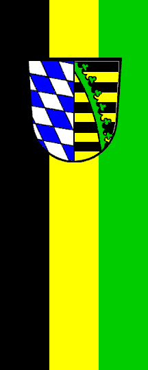 Black-yellow-green with the arms. The arms are from Bavaria and Saxony: Coburg belonged to the Saxon-Thuringian duchy of Saxe-Coburg-Gotha. When the other Thuringian territories united in 1920, the area around Coburg joined Bavaria after a popular vote. Arms from Stadler 1964-1971.