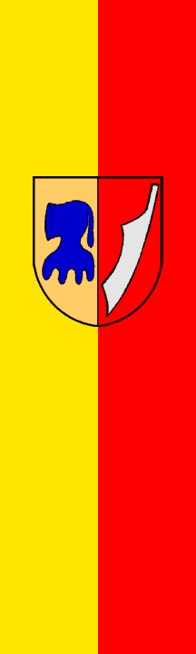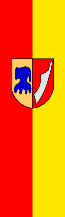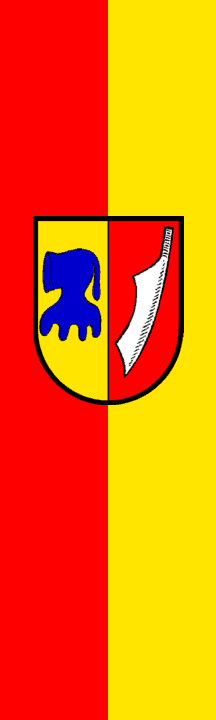 The Gemeinde Neuching adopted arms on 7th July 1975, blazon: Per pale Or, a cowl Azure, and Gules, a billhook bendwise sinister point downwards Argent. The flag of red-yellow (with the arms) was officially adopted on 10th June 1983.