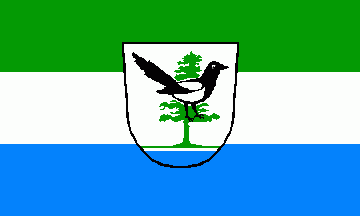 The pine is symbolising the local heather landscape. The blue base the small name giving river. The magpie (German: Elster) is a punning element.