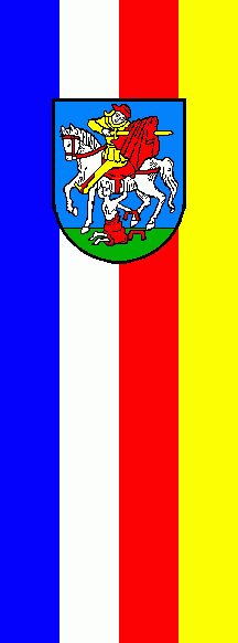 It is a blue-white-red-yellow vertical quadricolour. The coat of arms is shifted to the top.