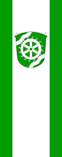 It is a green-white-green vertical triband with ratio of stripes approx. 1:4:1. The coat of arms is shifted to the top within the central stripe.