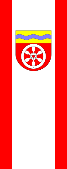 It is a red-white-red vertical 3-stripes banner, the ratio of the stripes is approx. 3:7:3. The coat of arms is shifted to the top within the white stripe.