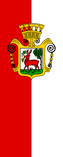 It is a red-white vertical bicolour. The coat of arms is shifted towards the top.