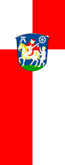The banner is off centred quartered of white and red. The coat of arms is upon the common point of all quarters.