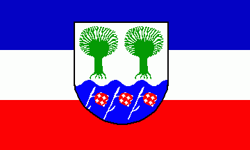 It is a blue over white over red horizontal tricolour, i.e. the civil flag of Schleswig-Holstein, superimposed by the municipal coat of arms.