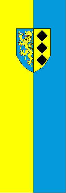 It is a yellow - blue vertical bicolour. The coat of arms is shifted to the top.