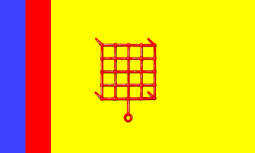 It is a blue red yellow vertical tricolour with ratio 1:1:4. The coat of arms without shield is slightly shifted to the hoist.
