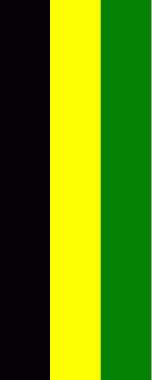 The banner is a black-yellow-green horizontal tricolour with centred arms.