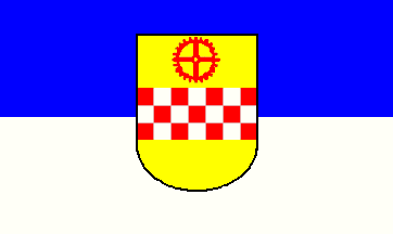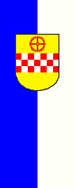 The ratio is 5:2. It is a vertically divided blue and white flag superimposed by the coat of arms, which is shifted to the hoist.