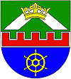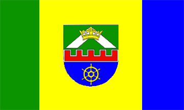 This is the flag of Glowe; Rügen county; Mecklenburg-Westpomerania. The flag is a vertically divided tricolour from hoist to fly into green, yellow and blue. The ratio between stripes is estimated 1:3:1. In the centre of the yellow field is the municipalities coat of arms. Its ratio is 3:5. The coat of arms is divided by a red fess with an embattled line at the upper side into a green chief and a blue base. In the centre of the blue field is a golden (=yellow) steering wheel. In the green field is a silvery (=white) chevron pointing upward and not touching the edges. The top of the chevron is superimposed by a golden (yellow) countal coronet. Source: I spotted this flag on top of the administration hut on 3 January