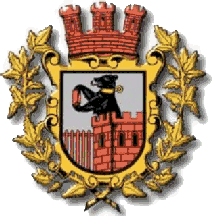 On top of the tower is a half black rampant bear, tongued red, wearing