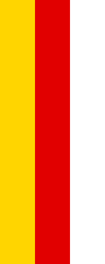 It is a yellow-red-white vertical tricolour having a reverse without arms (see right image above) and an obverse with arms is shifted towards the top (see left image above).