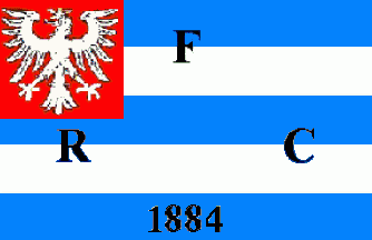 It is a horizontal 5-stripes flag with alternating light blue and white stripes starting with a blue one. The stripes are superimposed by black capital letters "F" upon stripe 1 and 2 (centre), "R" upon stripe 4 and 3 (hoist) and "C" upon stripe 4 and 3 (flyend). In the centre of stripe 5 is a black "1884". The flag has a red canton with the white eagle of Frankfurt. (The current flag has one stripe more)