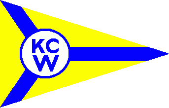 It is a yellow, triangular pennant with a white disc shifted to the hoist. The disc has a blue fimbriation and displays blue initials "KC" (1st line) "W" (2nd line). The disc is connected by blue bars with each point. The colours are the same like those of the local derowing club and the city of Wertheim. The blue shade shade on the city flag is celestial blue.