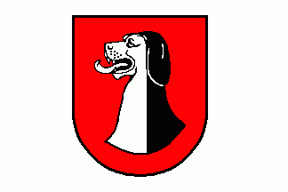 It is a blue over orange horizontal bicolour. In its centre is a B/W version of the local coat of arms with a mural crown. The coat of arms shows St.Martin and the beggar. The shield is flanked by black inscriptions äRä and äVä (blue stripe) and äBADä and äEMSä (orange stripe).