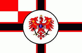 The flag is divided per bend sinister into red and white. In the red partition are the initials in Gothic letters, connected to a logo. In the white partition is a crowned red eagle, having an inescutcheon, probably the lesser arms of the Electorate of Brandenburg.