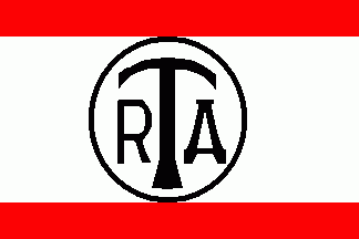 white charged with black serifed "R"(hoist) and "T"(fly), red(top) and black(bottom).