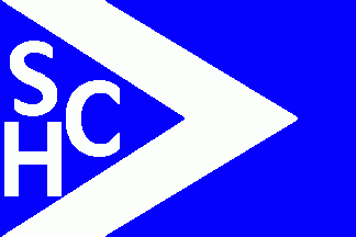 The flag was blue at hoist parted by a broad white chevron pointing to fly. On the hoist side was a white inscription in triangle "SHC".