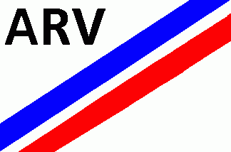 The white flag is parted by a blue bend sinister and a red bend sinister with a white gap between both, on upper hoist ia a black inscription "ARV".