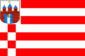 The flag is in style of the city flag of Bremen with only seven stripes. The white canton covers the hoist of the three upper stripes and bears the city arms.