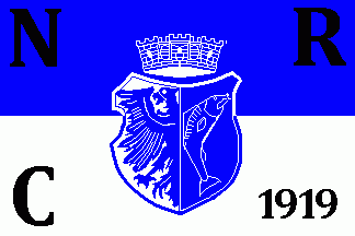 The flag was white with red oar in bend crossed with a red trident in bend sinister, flanked by red hand writing letters "R." (hoist), "C." (top), "N." (fly) and "P." (bottom).
