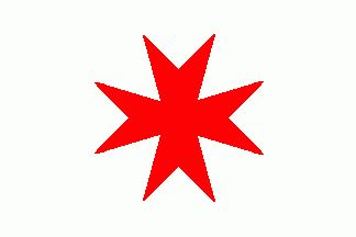 The white flag had connected red and black horizontal stripes at top and bottom with the red stripes on the edges. On centre was a big black 8-point star.