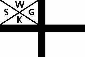 The white flag was parted by a black centred cross. The upper hoist quarter was parted by a thin black saltire with black initials on every quarter as follows: