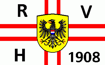 It is a red over white horizontal bicolour, in the centre is a shield having a black chief with a dotted white inscription "R.V.E.". A white horse is standing before a black tree. The horse is taken from the coat of arms of Wanne-Eickel.
