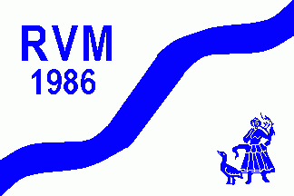 The white flag is parted by a blue wavy ascending line. On upper hoist blue centred inscription "RVM"(1st line, bigger) "1986"(2nd line). On lower fly the maiden and goose from the city arms of Monheim upon Rhine.