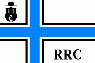 The shield is topped by a red mural crown made. In the lower fly are black serifed capital letters "RRC".
