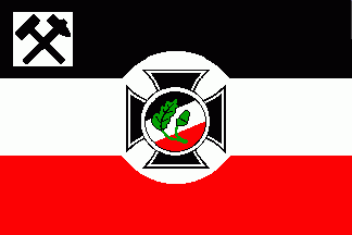 Shifted to hoist on the white part are th city arms in blue and white (eagle with quartered inescutcheon on breast) under a blue inscription "RV RHeinsberg".