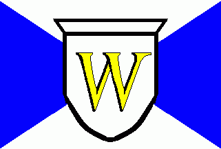 The flag was parted per saltire of blue and white. On centre was a white shield charged with a golden (=yellow) "W" from the crest of the city arms.