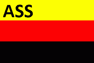 The flag is a yellow-red-black horizontal tricolour. At hoist on the yellow stripe is a black inscription "ASS".