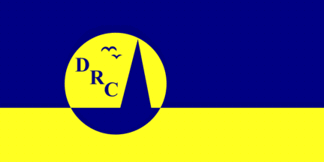 Shifted to hoist is a disc in counterchanged colours, the yellow part displays a blue triangle, representing a sail, two blue flying birds and a blue inscription "DRC" in bend.