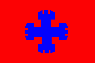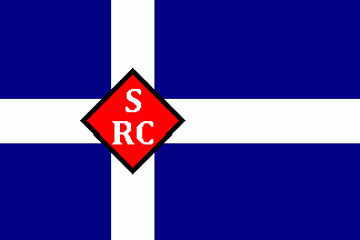 The blue flag is parted by an off-centred white cross. On its centre on a red lozenge fimbriated black is a white inscription "S"(1st line) and "RC"(2nd line).