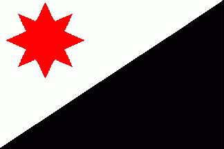 The flag is parted per bend sinister of white and black. On canton is a red 8-point star.