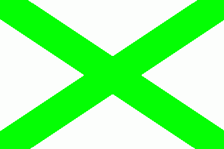 The white pennant is parted by an off-centred green cotized cross, on upper hoist is a green Holsteinnettle leaf charged with a white rectangle, containing in green a triangle, a half circle and an annulet.