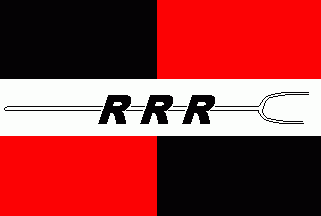 The flag is quartered of black and red. On a broad central white stripe is a white oar with black edges pointing to fly and superimposed by black Italics "RRR" (see left image above).