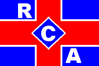 The blue flag is divided by a broad red centred cross fimbriated white with white inscriptions "R"(upper hoist), "C"(centre on a blue diamond fimbriated white) and "A"(lower fly).