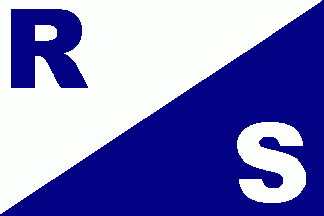 The flag is parted per bend sinister of white and blue with inscriptions in counterchanged colours "R"(blue, upper hoist) and "S"(white, lower fly)