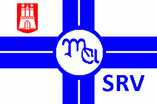 The white flag was parted by a blue centred cross, parted by a thin white centred crosslet. On upper hoist quarter were the city arms of Hamburg.