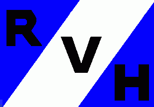 The blue flag is parted by a broad sinister-bendy white stripe with black inscriptions ordered per bend, one letter on every partition, reading "RVH".
