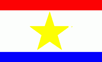 The white flag has a red stripe at top, blue stripe at bottom and a yellow 5-point star on centre.