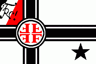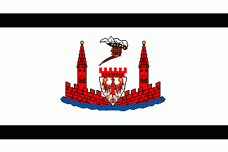 It is a white flag divided by a black cotised cross with intersection point of crossbars shifted to the upper hoist, superimposed by a roundel containing the logo of Deutsche Turnerschaft. The logo has four red "F"s forming a cross and being the abbreviation of "Frisch Fromm Fröhlich Frei". In the upper fly are white capitals with black edges "SRCF". In the lower fly is the image of a red masoned wall with two towers. The wall is superimposed by a golden crowned silvery shield with a red eagle (Electorate of Brandenburg) topped by a crest. The whole is the coat of arms of former Spandau borough.