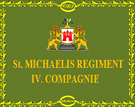 According to source the ratio is approx 4:5. It is an olive green flag. The flag has a golden bordure of oak leaves. Within the bordure are two ovals of the same colour with golden inscriptions. In the middle above the inscription is "Ao. 1813"; in the middle below "den 18. März". In the centre of the sheet are the Greater Arms of Hamburg, shifted to the top. In a silver (= white) shield is a red Hamburg castle. The shield stands on a greyish pedestal with three levels and is supported by two lions rampant, guardant, probably golden. The shield is topped by a helmet, which is crested by five flags in the colours of the five parochial regiments and some peacock feathers. Beneath the arms is a golden inscription, mostle in initials as follows: "St. MICHAELIS REGIMENT" (1st line; slightly bigger) "IV. COMPAGNIE" (2nd line). The flag is a donation of Christian Neumann, a descendant of the company's civic captain having the same name. Please note that the colours of the arms have turned out very pale. Thus their colours are not completely for sure.