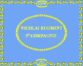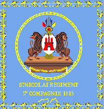 The blue silk today is nearly white. The ratio is according to filing card approx 11:13. The flag has a bordure of golden oak leaves. In the middle in a chain shaped like an oval is a golden inscription in capitals "Nicolairegiment"(1st line) "3. Compagnie"(2nd line). In small ovals at the edges are golden inscriptions "CFN" (top central, initials of a captain) and "1813 den 12ten März"(bottom central).